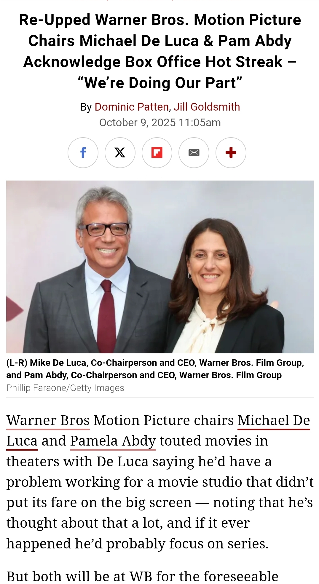 >>215411993If the OP post isn't enough for you to accept that he's most likely out, I don't know what to tell you. Superman lost money and the good will of critics and audiences went out the window with Peacemaker S2 and none of his stuff has been successful to keep him on. Simple logic. He might stick around for one final movie (Man of Tomorrow) but he's definitely out as head of studio, as well as Peter Safran. His DCU is dead. I doubt he cares. He can just go back to Marvel anytime. It's a no-lose situation for him. DC can just focus on Batman and Elseworlds.