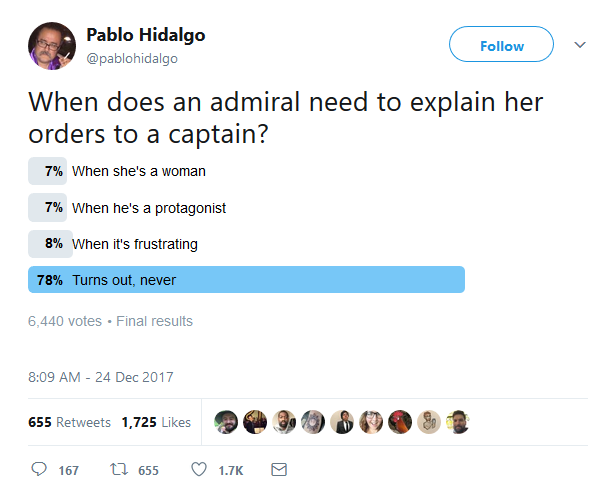 No this is exactly what Star Wars needed. Men need to put their egos aside and obey their superiors in times of war. Especially Trump supporters