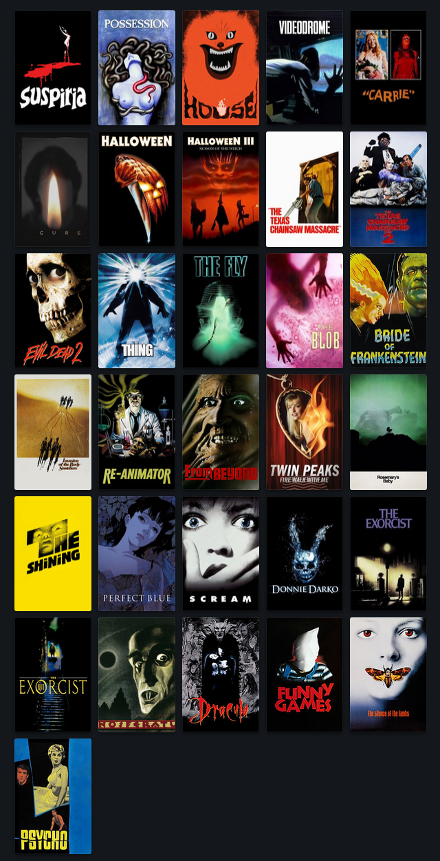 >>215500991I made a list of my personal Halloween canon. I considered putting Alien on but it didn't really seem to fit the vibe of psycho killers, demons, ghouls and such. Feel free to suggest me anything I might be missing.