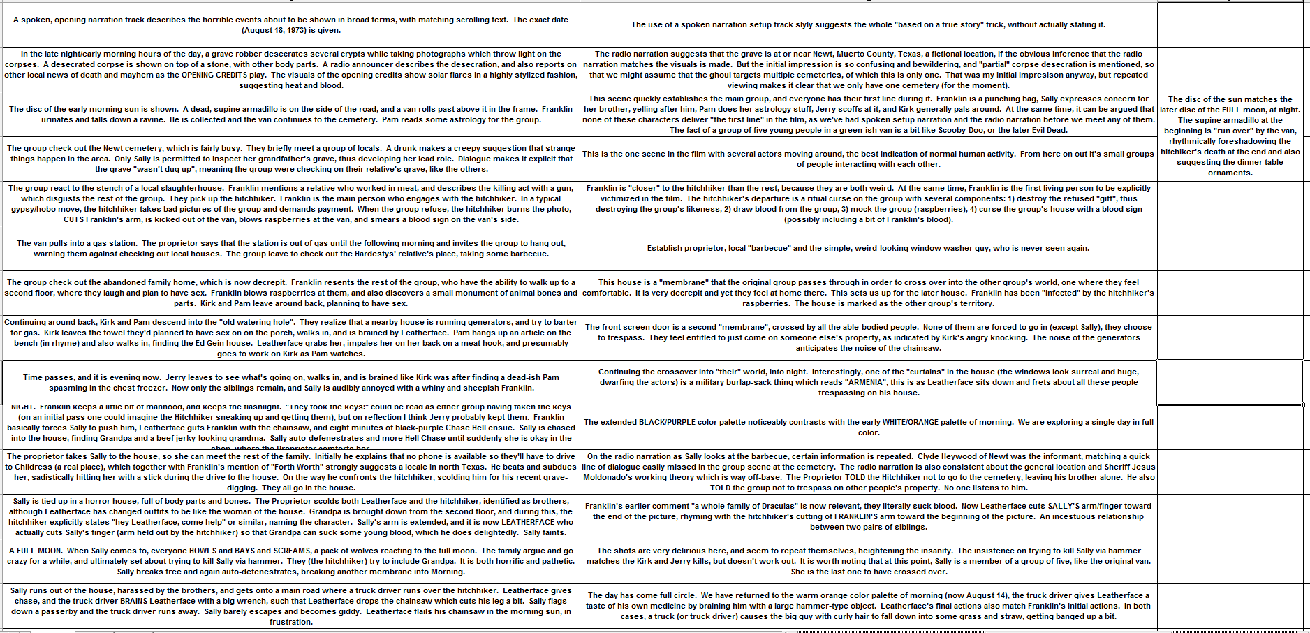 >>215500991There are a number of rhymes and story elements that reward repeat viewing:-Solar flare/eyeball. The film's opening credits use stylized footage of a solar flare to show that it's a very hot summer. A violent sphere, moving rapidly. These shots compare very well with the climax, which shows extreme close-ups of Sally's terrified, blood-shot eyeball. A violent sphere, moving rapidly.-Pig ramp/Metal door. Early in the film, Franklin the piggy is let out of the house using a wooden ramp, so he can pee. Kirk (the biggest normie of the bunch) is the only one who insists on picking up the hitchhiker, everyone else knows not to do it. Kirk INVITES the hitchhiker into his house (the van), then closes the van's metal door behind him. Later, Kirk barges into the house UNINVITED, onto a piggy ramp, gets his reward, and has a metal door slammed shut on him.-Two dollars. The hitchhiker demands two dollars as payment for his stupid snapshot, a dirty hobo trick. Kirk finally puts his foot down and says no. Later, approaching the house, Kirk hopes to barter for gas, this time hoping to give them "a couple bucks", or possibly his guitar.-Guitar case/chainsaw. The van's interior has multiple shots of junk in the back. One of the more prominent items is Kirk's guitar, in a guitar case. The top of the guitar case has metal studs around the edge, making it look very similar to the blade of a chainsaw. The most obvious shot (IIRC) is when they eject the hitchhiker, and you see the top of the guitar case in close-up at the same time.-Retrograde. Sally is trapped because she is moving backwards (like Pam's astrology), out the back window, back to the gas station. The only way out is to move forward again, through the front window onto the main road. She is the only one who proceeds this far forward, overall (the bench swing outside isn't good enough).