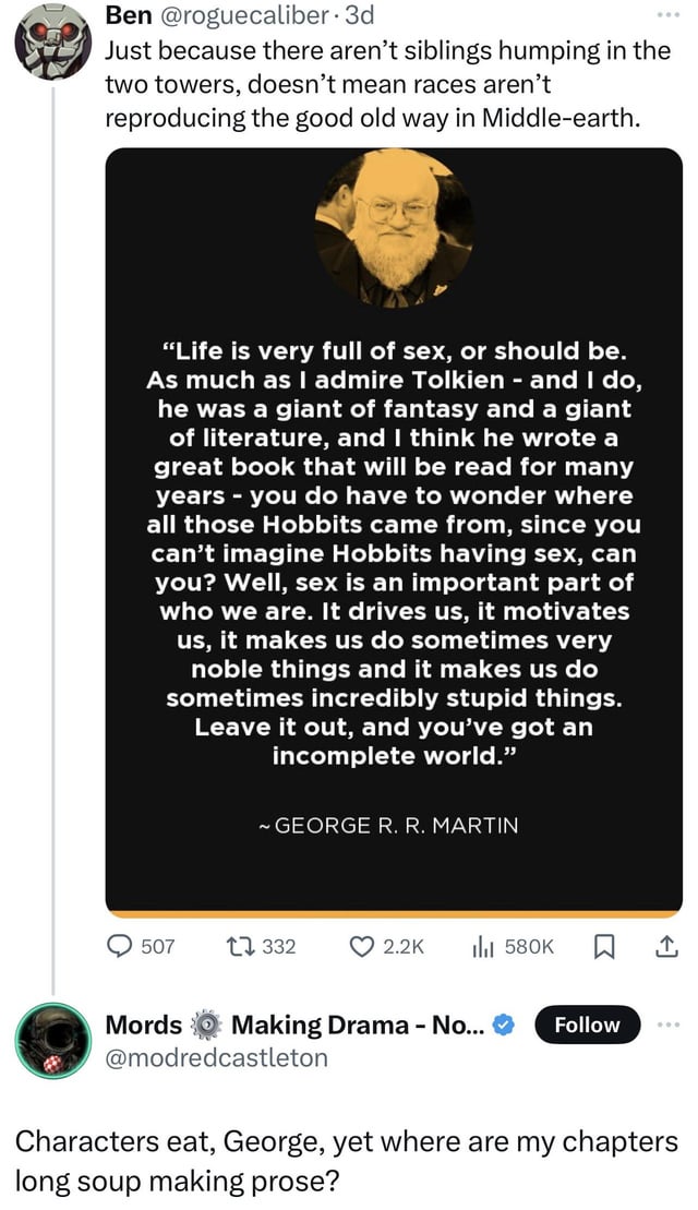 >>215520315>by trying to find some logic and common sense, OP implies that George R. R. Martin is a good writer and not a degenerate hackOP choose better.
