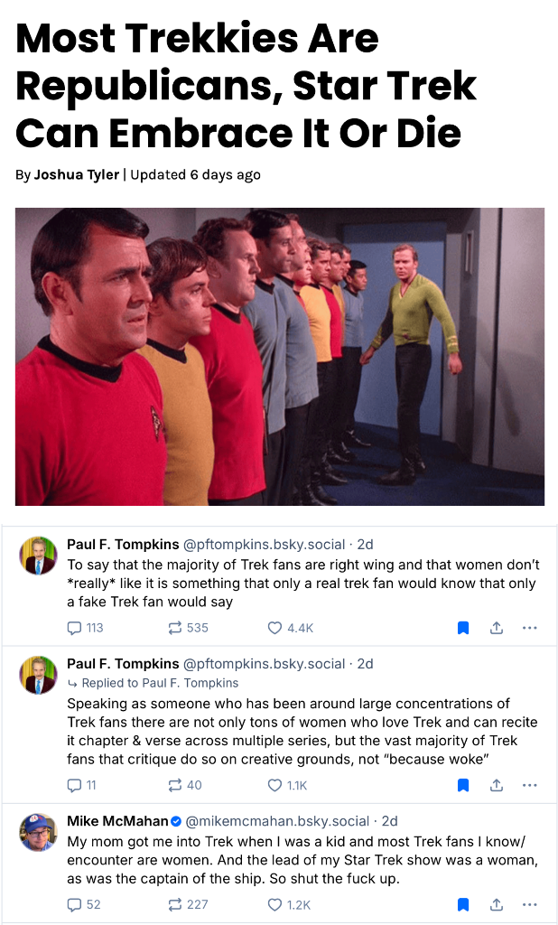 Conservatives only liked the original trek because it was horny and patriarchal. They also liked TNG because it was autistic and generally not as woke as it was supposed to be thanks to Roddenberry’s death (seriously who the fuck would want to live like the crew of the enterprise? No booze, 8 hour shifts , doing boring ass shit while Riker fucks all the hot girls and aliens? Fuck that.)