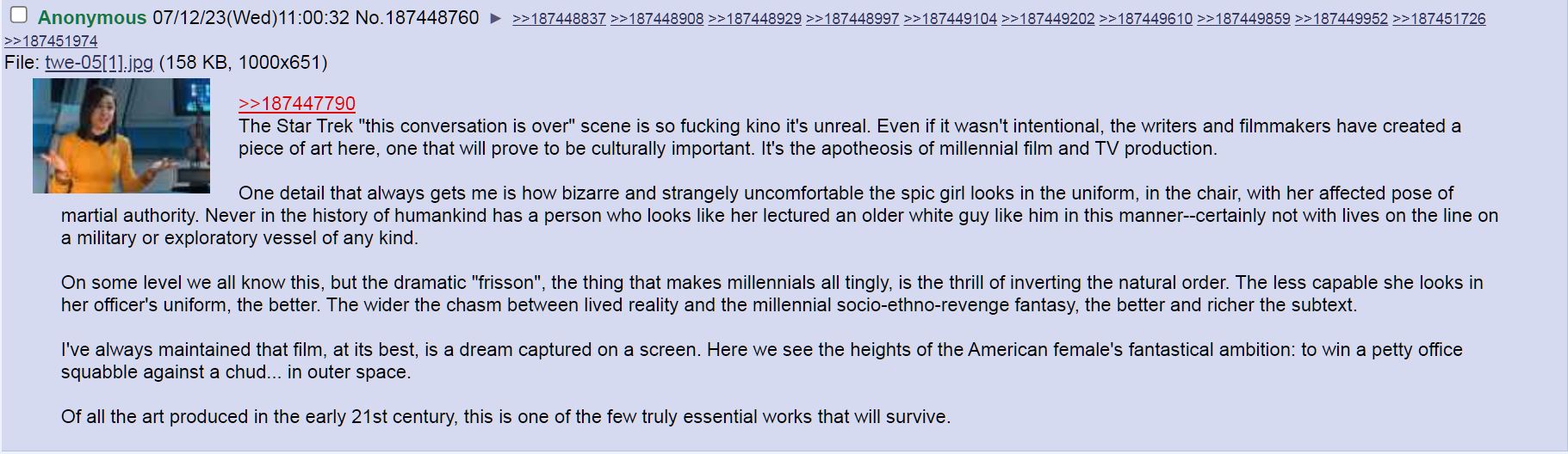 >>215560824>you’re such a corporately brainwashed consumer that you’d watch anything with the correct brand label on itI have 0 idea what argument you're even making here. They assumed I would watch anything so they pozzed everything in the ass for what purpose exactly? To appease people that didn't watch these shows anyways?>it is extraordinarily easy to confuse modern real life liberals with the consumers who frequent r/startrekIt is also extraordinarily easy to use the no true scottsman fallacy. >do you think the guy who wrote his doctoral thesis on the odyssey and has a starfleet uniform in his closet, actually likes nutrek?A guy like that is likely in his 40's and probably would disagree with you on whether or not dudes that cut their dicks off are women so therefore would also be considered far right by most modern leftists.