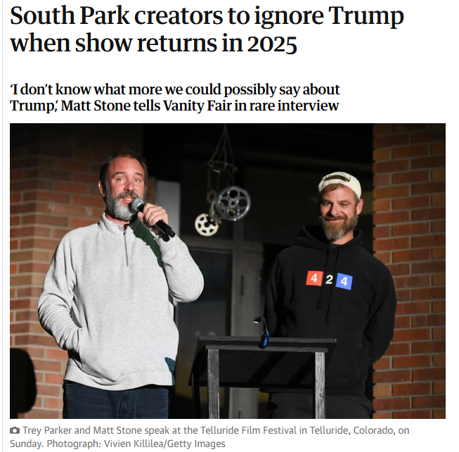 >>215577576NTA, but it's not even the fact that it's 7 episodes straight about Trump. It's because 99 percent of it has been the same joke.Shitty Wok guy with the tariffs was funny. Clyde and Cartman being Crowder/Kirk style debaters was good. Krist Noem shooting puppies was fucking hilarious.You know what's not funny? Small penis for the 500th time in 7 episodes. Even when Garrison was the Trump surrogate, they repeated the "fuck em all to death" joke, but they didn't flog it into the ground until it was paste.