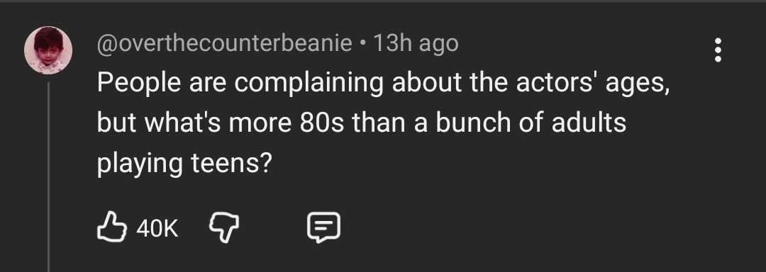 >>215587145Yeah, a group of 30 year old actors are gonna play a group of middle schoolers? Or has time passed in the show's universe? In that case, the show is taking place in mid 90s now.