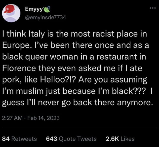 >>215679503>Italian is considerate enough to make sure he doesn’t accidentally serve pork to a Muslim since lots of African Muslims live in ItalyHow is that racist? Imagine these Amerimutts saw real racism