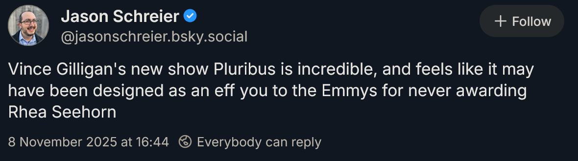 135, why? I knew the world would be watching because of BB and BCS, but I really thought because it's on a tiny streamer with the cast it has it'd just be ignored, not actually watched and attacked and praised.