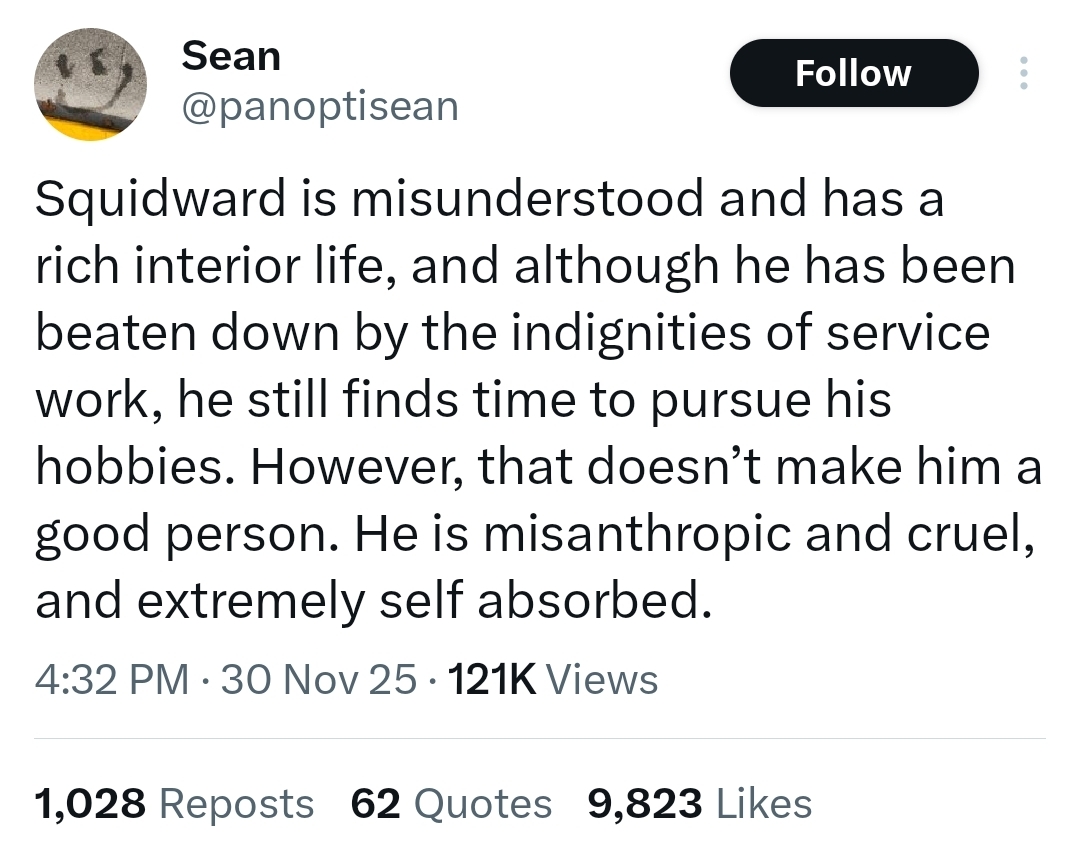 >>216308520True. But zoomers take it a step further. They would argue about the exact details of Squidward's early life, and look for a right or wrong answer.