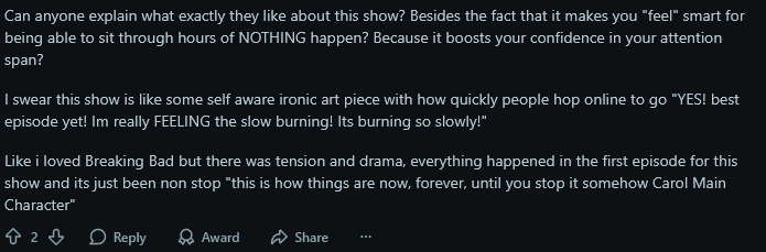 >>216549208It's the first episode where something happens in this entire godforsaken season.