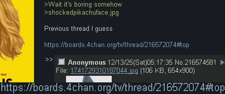 >let's make a show about an antagonist that can't lie, is really nice and can't do anything to the protagonist>also the protoganist doesn't interest with them or do anything>Wait it's boring somehow>shockedpikachuface.jpgPrevious thread I guesshttps://boards.4chan.org/tv/thread/216572074#top