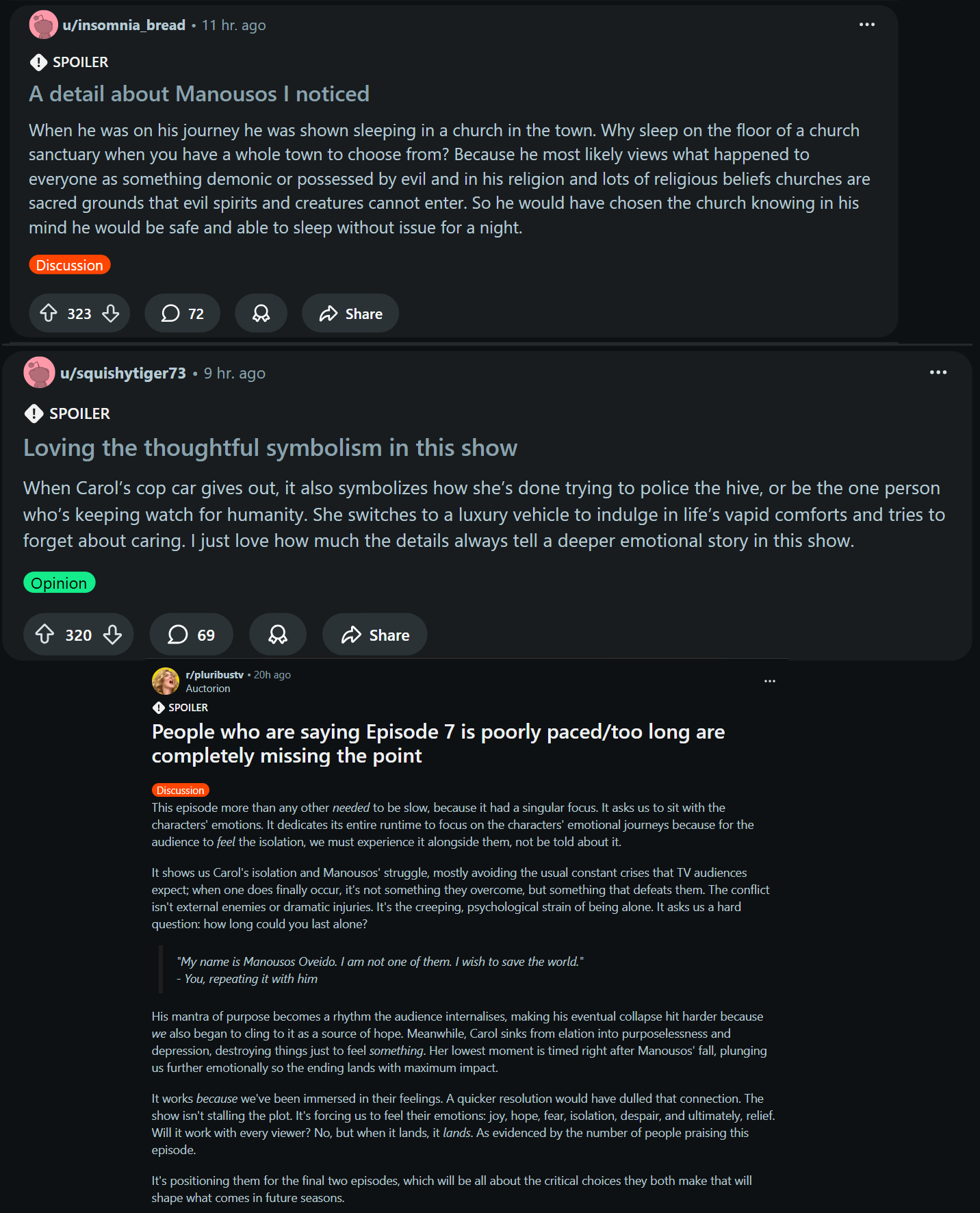 >>216574639>>216574645>>216574711>>216574689People who are saying Episode 7 is poorly paced/too long are completely missing the pointThis episode more than any other *needed* to be slow, because it had a singular focus. It asks us to sit with the characters' emotions. It dedicates its entire runtime to focus on the characters' emotional journeys because for the audience to *feel* the isolation, we must experience it alongside them, not be told about it.It shows us Carol's isolation and Manousos' struggle, mostly avoiding the usual constant crises that TV audiences expect; when one does finally occur, it's not something they overcome, but something that defeats them. The conflict isn't external enemies or dramatic injuries. It's the creeping, psychological strain of being alone. It asks us a hard question: how long could you last alone?>*"My name is Manousos Oveido. I am not one of them. I wish to save the world."* >*- You, repeating it with him*His mantra of purpose becomes a rhythm the audience internalises, making his eventual collapse hit harder because *we* also began to cling to it as a source of hope. Meanwhile, Carol sinks from elation into purposelessness and depression, destroying things just to feel *something*. Her lowest moment is timed right after Manousos' fall, plunging us further emotionally so the ending lands with maximum impact.It works *because* we've been immersed in their feelings. A quicker resolution would have dulled that connection. The show isn't stalling the plot. It's forcing us to feel their emotions: joy, hope, fear, isolation, despair, and ultimately, relief. Will it work with every viewer? No, but when it lands, it *lands*. As evidenced by the number of people praising this episode.It's positioning them for the final two episodes, which will be all about the critical choices they both make that will shape what comes in future seasons.