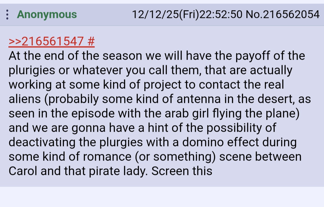 >>216771311Carol will deprogram her with the "I" shit or put her in a Faraday cage, then she'll spill the tea on how to unplurb everyone. Won't happen until final season.>>216771332Scientists are retarded. They literally sent our address into space in the 70s without consulting anyone. >>216774723Extremely based. He dropped the ball with when they made them too hipster for vegan (and not even bringing up the ethical contradictions). But he delivered at the last minute with feet and hardcore plurbing. Alright, Vince, you son of a bitch, I'll watch S2.