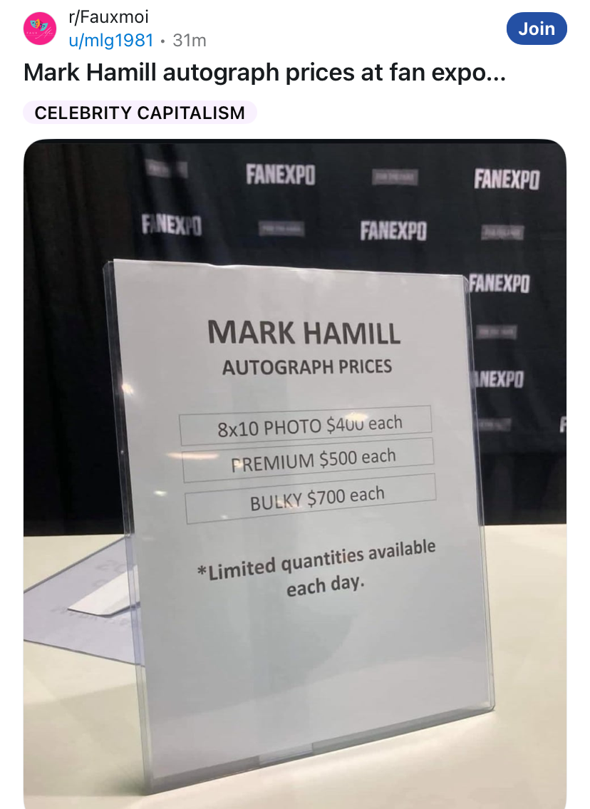 >charges 600 bucks for photos at cons>wonders where his fans went............