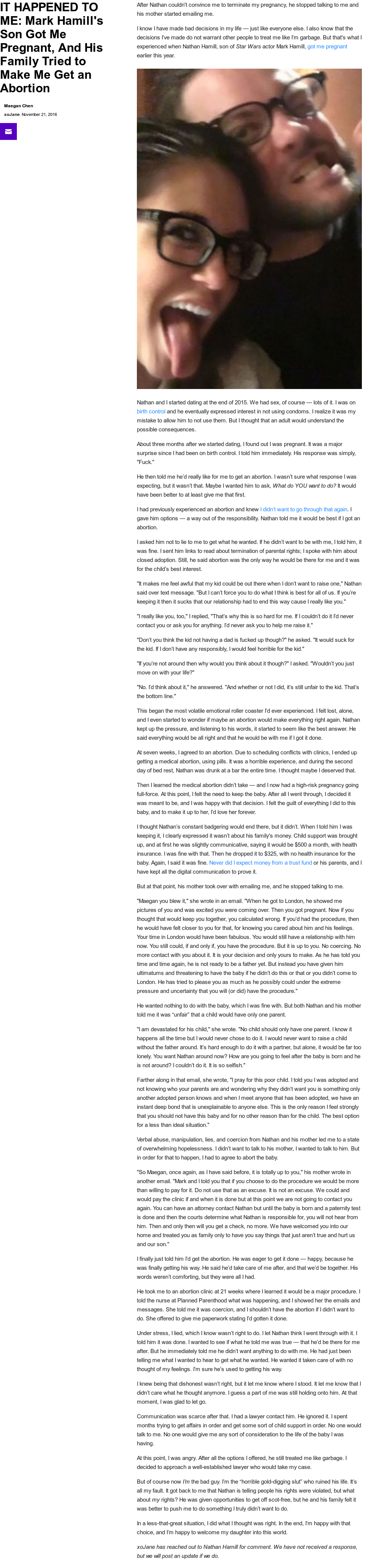 >>216801803>know a guy for three months>let him rawdog you>oops i'm pregnantNot that I'm defending Hammil but you have to understand women never take accountability for their actions. I bet she was trying to babytrap him and it didn't work out.