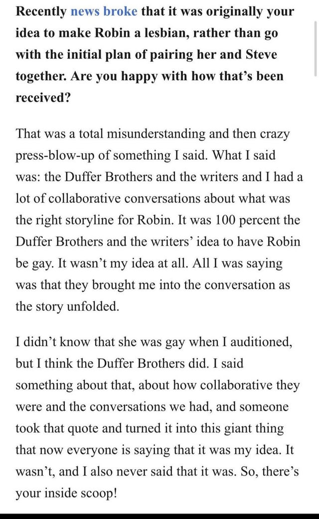 >>216880791Nepo baby demanded Robin be gay and they already had written and filmed a bunch of stuff so Steve's character growth just got torpedoed and so they just gave him oneitis for Ms. Skeltal.