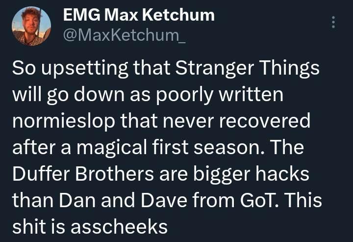 the only reason i watch this show is because there's nothing like it. i like these fun amblin-esque adventure stories full of horror and action and nice characters, all the things the duffers are influenced by (carpenter, spielberg, nightmare on elm street, etc) are things I also like. they put everything in a blender and made a new thing out of it, and this is the formula for how we used to get things like star wars toounfortunately the show is just quite bad now and i don't think it'll stick the landing. everyone seems to be unanimous that season 1 was the best