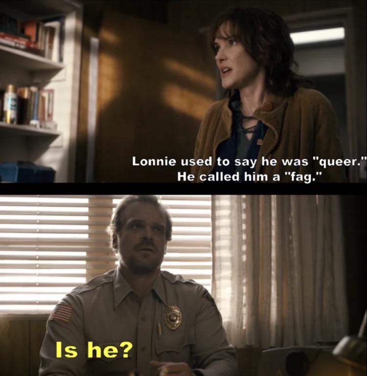 >>216893329Duffer Brothers have Daddy issues >Hopper is troubled by the loss of his little girl. Family collapses. Frequently mentions having a rough father himself >First season has character called "Papa" who is actively abusive and manipulative >Jonathan/Will have shitty father who is forgotten about by S2 >Eleven is adopted by Hopper and immediately Hopper becomes an abusive tyrant which Eleven is routinely justified in disobeying >Dustin has single mother >Billy has abusive Dad who torments him and exacerbates all of Billy's issues >Only father figure routinely shown is Ted who is always shown as out of touch or incompetent >Ted is given one moment of heroics and is gravely injured and then never shown in the season again (until finale?). Not a single character mentions him by name or is shown having concern >literally the only good Dad shown is the Russian prison guard who must surely be canonically getting his ass blown out in a CIA black site right now >every other character is gay What did they mean by this?