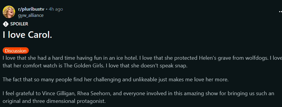 I love Carol.I love that she had a hard time having fun in an ice hotel. I love that she protected Helen’s grave from wolfdogs. I love that her comfort watch is The Golden Girls. I love that she doesn’t speak snap. The fact that so many people find her challenging and unlikeable just makes me love her more.I feel grateful to Vince Gilligan, Rhea Seehorn, and everyone involved in this amazing show for bringing us such an original and three dimensional protagonist.