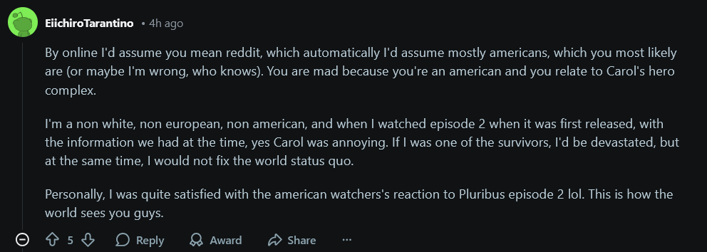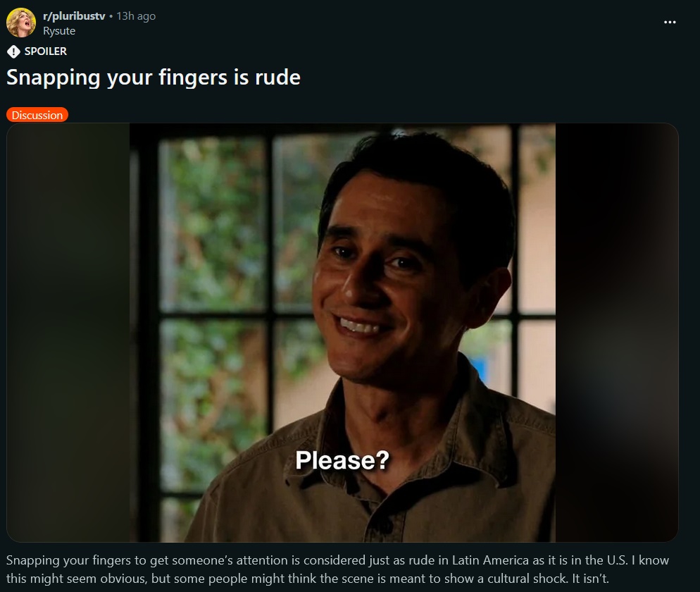 I swear I've had some conversations on subs for this particular series that have me questioning my sanity and whether or not everyone's been kicked in the head. I know that sounds snobbish but I've seen everything from one person arguing that the plurbs have already won (when we've only just finished season 1) to someone who thought they were harmless and cared about consent.Feel like they're watching a different show.Not to be ageist, but I wonder if the confusion/shallowness/confusing conversations are because this is Gen Z’s “Breaking Bad”, and they have grown up with a very different kind of media than older folks have.