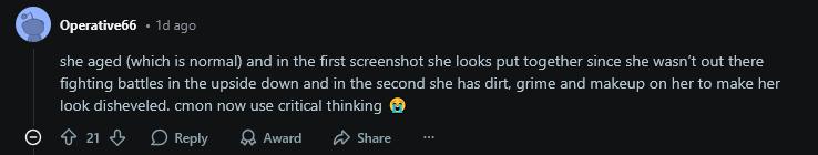 >>216916401Redditors are so dishonest. Its obvious her makeup is not what we are talking about.
