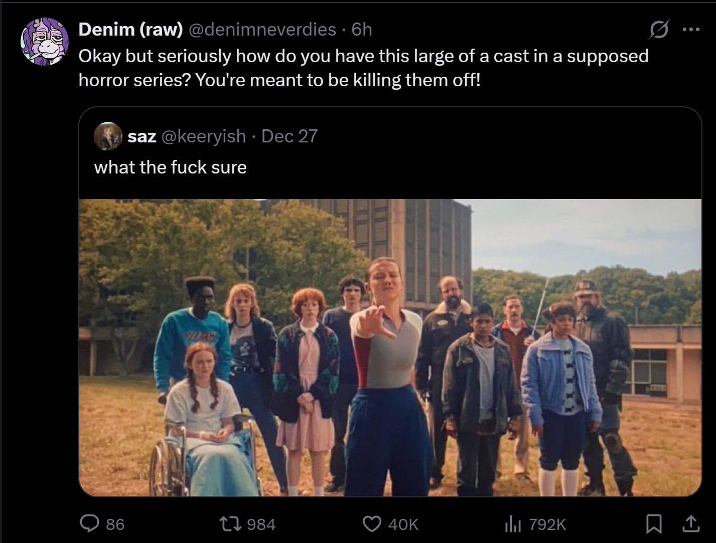 >>216925083don't they just kill off the straight white men? The only one they didn't was Steve Harrington, but I haven't seen season 5 yet so he could be gay by now or dead/