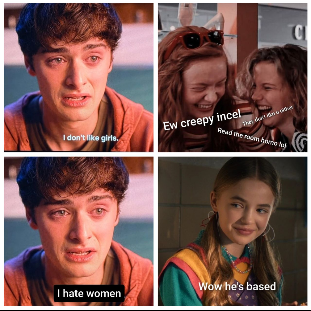 >>216929435>Vecna calls Will "homo" during their battle (Netflix doesn't have the balls to have him say "fag") >Will wags his finger and says something like "my friends like ME for ME you have no power over Me anymore">Vecna will recoil in fear as his power over Will drains, loses his balance, roars>Vecna on bended knee admits he was wrong, denounces right wing extremism and hate speech>Is redeemed