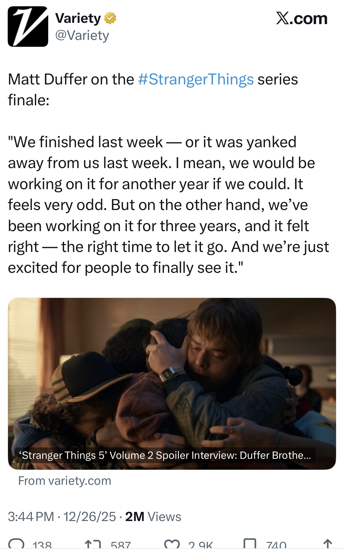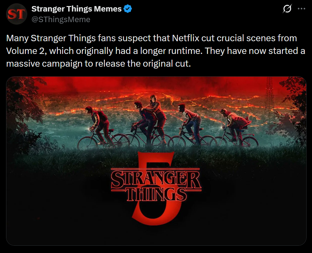 >>216931466>season 1 was an entirely complete storyan entirely complete story about a weird demon from an unexplained dark mirror dimension that does stuff for unexplained reasons and is fought by a girl with unexplained powers from an unexplained military program. or, here's a hot take: the Duffers were never good and just relied on limited audience POV to get away with not planning ahead at any point. the only reason they originally conceived the show as as "anthology series" is because that let them justify not worrying about worldbuilding. plus you are simply skipping the plotholey government behavior that exists only because season 1 was ripping plot points from movies that didn't need to spin their story out for 8 episodes. that stuff is bad: its in the show because the Duffers never had to bother writing well because the Netflix system is broken and doesn't encourage planning beyond the first season.