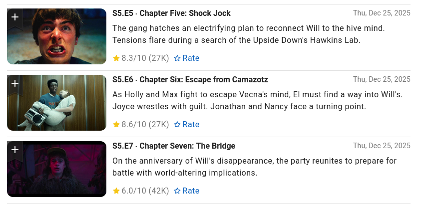 >>216930623The writing has been dogshit, the directing as been dogshit and the action scenes have been insultingI think it's been a case of one by one these faults have become apparent to everyone. The terrible "20 soldiers standing in a circle unloading their ammo into one demogorgan without him flinching" left a sour taste in most people's mouths but they were willing to overlook it.Now with all these overlong, overexplained pieces of dialogue by adults pretending to be kids just starting puberty, people are realising that they simply don't care about these characters and their stories. The terrible acting is also really obvious now that they've switched to serious stuff. The other Psychic girl is no longer British? The massively hyped little girl from the first 4 episodes has zero acting ability aside from looking distressed with her mouth hanging open. The less said about the special effects the better, them trying to repeat the running scene from the last season looked comically bad, running on a treadmill in a green screen room whilst they inexplicably have a bright white light shining in their face despite being in a moody red lit universe.