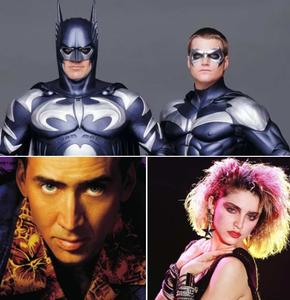 BATMAN UNCHAINED (1999)>Batman (George Clooney) fights crime alone once again after Robin (Chris O'Donnell) leaves Gotham due to disagreements about Batman’s methods and Batgirl (Alicia Silverstone) returns to England to complete her studies. Meanwhile, biochemist Jonathan Crane (Nicolas Cage), who wants revenge on Bruce Wayne for cutting his research funds, joins forces with toymaker Harley Quinn (Madonna), who wants revenge on Batman for the death of her father, the Joker, and they expose Batman to the fear toxin and lock him up at Arkham Asylum.>At Arkham, Batman is put on trial by hallucinations of his past enemies – the Joker (Jack Nicholson), the Penguin (Danny DeVito), Two-Face (Tommy Lee Jones) and the Riddler (Jim Carrey) – but ultimately conquers his fears and manages to escape. He then makes amends with Robin and they join forces to prevent Crane, now calling himself “Scarecrow”, from spreading the fear toxin through Gotham. Harley, who doesn’t want to hurt innocents, betrays Crane and helps the heroes stop him. Crane and Harley are arrested, and Batman leaves Robin – now calling himself “Nightwing” – to protect Gotham while he goes on a spiritual journey to the Middle East.