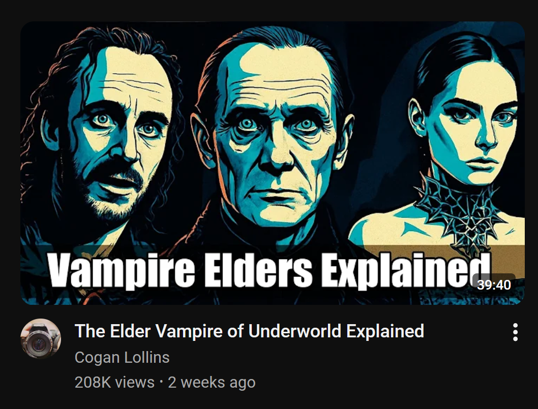 >over 200 thousand people watched a 40 minute lore video about the fucking vampires in the Underworld movesSometimes it feels like 90% of the world is completely retarded