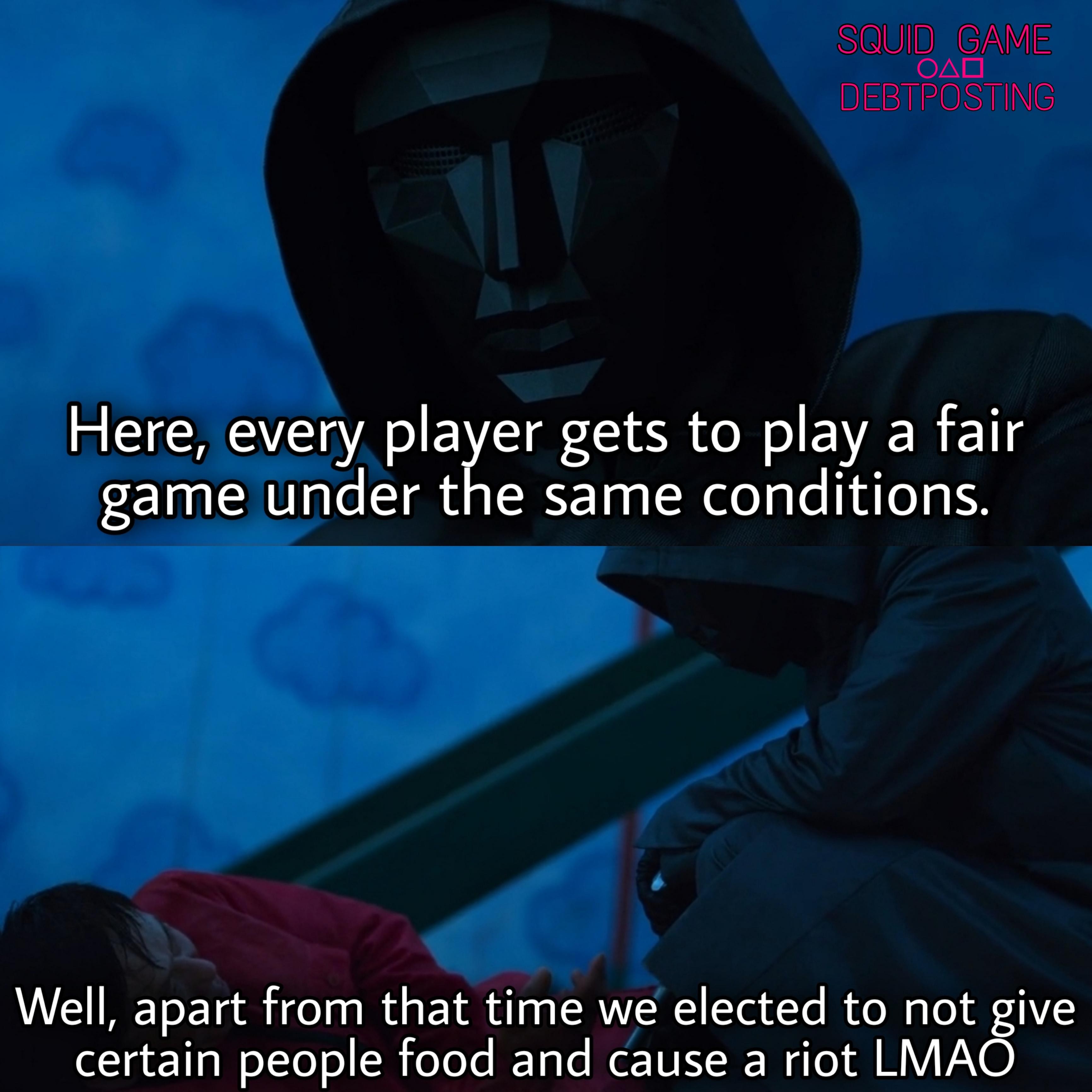 >>216955973The old guy who run the first game was closer to fair, let those who wanted to leave, leave (after already having many killed), the frontman who run the second game outright rigged the vote. But, the old one wasn't truly fair either, he approved that bridge explosion, that caused a lethal injury to the nork woman, also approved of the killings to reduce player count.Also the whole game isn't truly fair to begin with, e.g. jumping game would be outright impossible for some players (fat, old, injured). E.g. some of those that were picked up for the game, down on their luck already, likely have some physical conditions at the start, bad knee, or something. I gues if there will be an american spinoff, and it will try to be honest, there will be a lot of unhealthy participants, as the american general population is a lot less healthy than the korean, such a game would also likely devolve into a racewar between the participants, so I doubt that there will be honest depiction of situation.