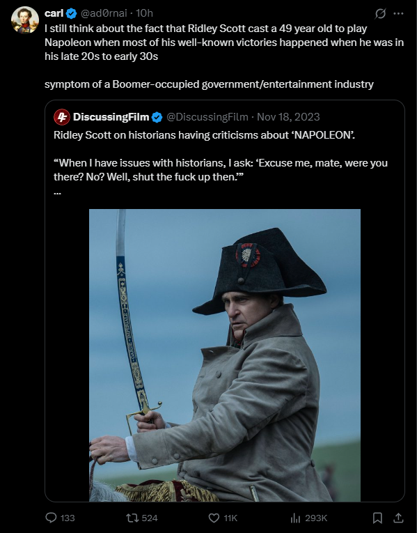 >>216961199It's the same mistake they made with The Irishman. Why they made old actors act as young versions of themselves instead of two different actors playing the same character?Simple solution: Timothee Chalamet as young Napo, Phoenix as old Napo.Anyway, Scott is an asshole with no really good movies in decades.
