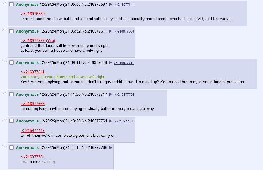 >>216977611>at least you own a house and have a wife rightYes? Are you implying that because I don't like gay reddit shows I'm a fuckup? Seems odd bro, maybe some kind of projection