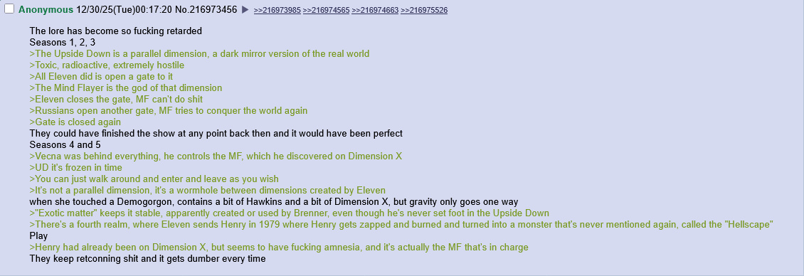 How did they fuck up so bad ignoring the season 4 cliffhanger? I was expecting a fucking WAR between the military and the monsters, with Eleven going Super Saiyan , but still losing and then other gates opening up all over the world (no wormhole bullshit), a real apocalyptic season with an all out monster invasion. Not this queer fag garbage.