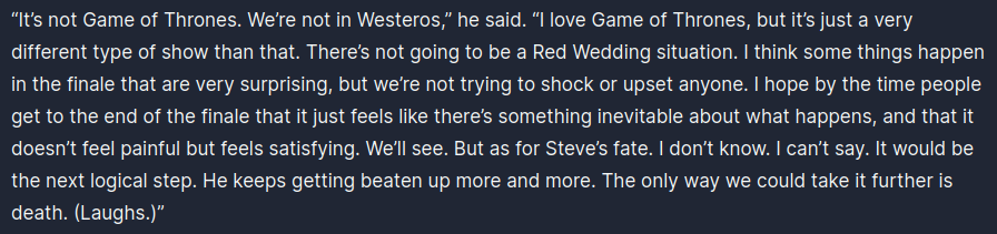 As far as the kids go, I wouldn’t be surprised if Lucas or Dustin bite the bullet.