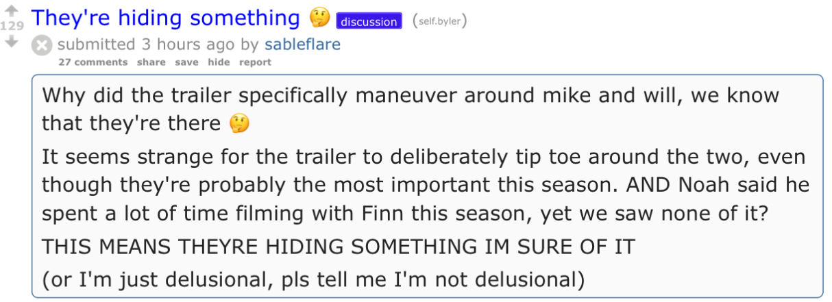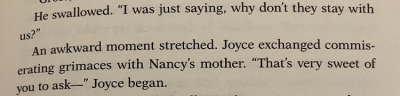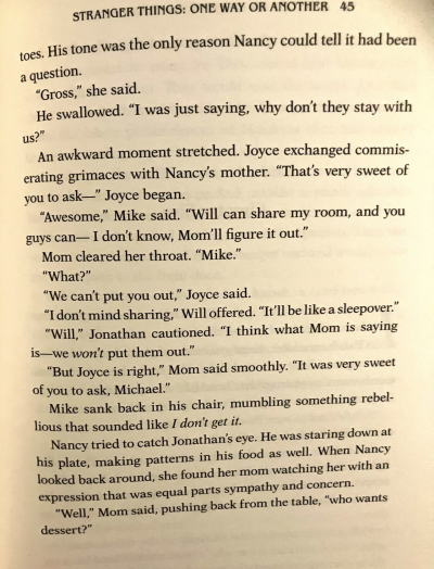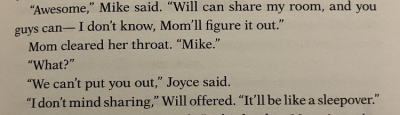 Are the bylersisters onto something? This is an excerpt from the tie-in book One Way or Another, which is about Nancy pre-season 5. The book is written by a writer for the show, for season 5, so it's not like it is some rando or fan. Mike was the one who suggested the Byers move in with them over quarantine, and initially wanted Will to stay in his bedroom without caring much where Joyce and Jon would sleep. Kinda sus. 1/2 picrel.