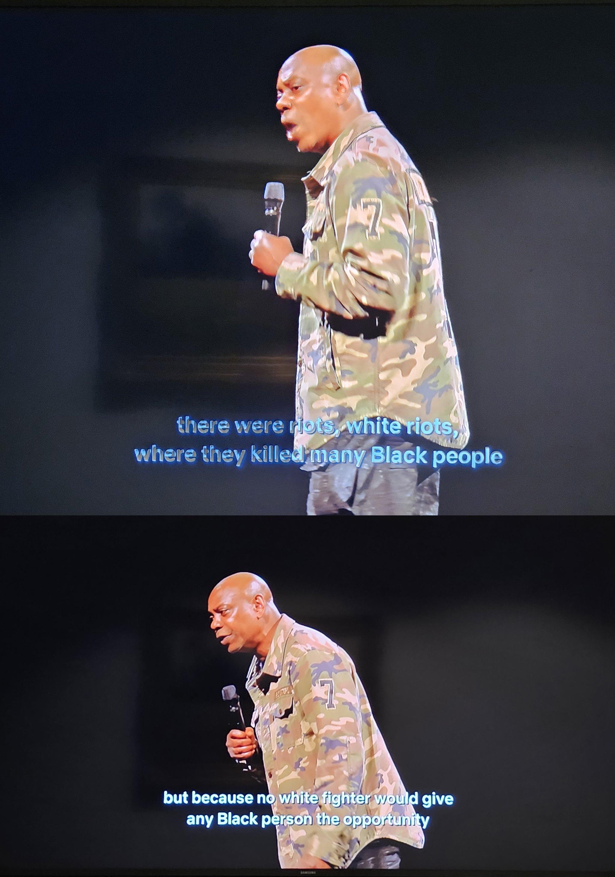 >>216992328Well Shane did a similar joke that Dave did about white america being mad at a black athlete with Jackie Robinson. Except he did it in under a minute and it was funny. Dave really does just fucking ramble on too much but cause hes Dave Chappelle he gets a pass.
