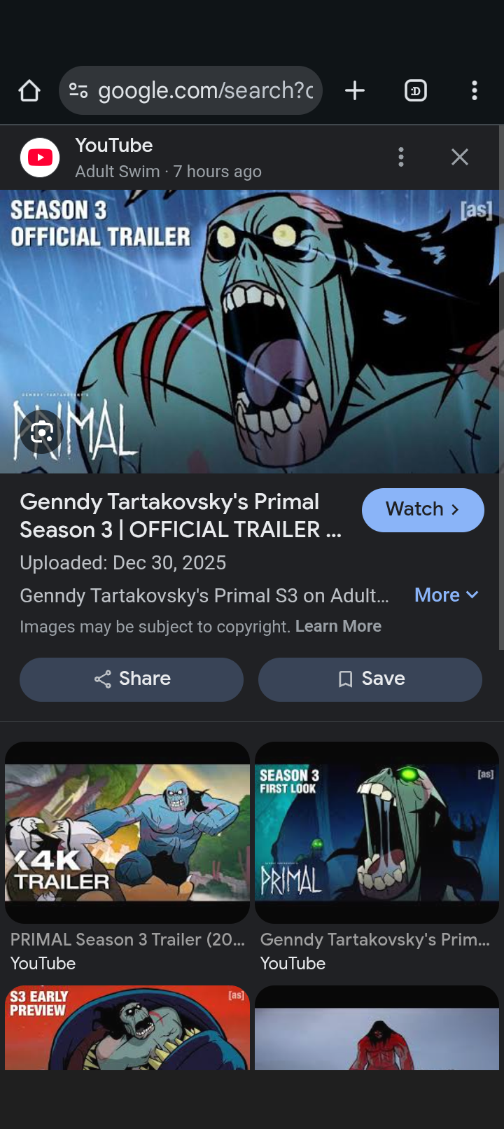 >https://youtu.be/VLu-9RA4-9c?si=kBxsANOlWpm_oGZy>"For the third season, I thought, alright, well, we've got 20 episodes. We probably should be done," Tartakovsky told the CCXP crowd. "I hope everyone's seen it! We killed off Spear, and I wanted to make Primal an anthology show. Still, it says Primal, but then it would be 'Creation' or something, a different heading. So I started to draw, and the first idea was of this orange alien girl and a blue man. They were born, kind of like Adam and Eve, and they struggle and they fight different creatures. It kind of felt just not right.">"And so it wasn't working," he continued in reference to the orange girl and blue man. "And I'm like, 'Oh, maybe more alien, kind of insectoid things.' And that wasn't working. Then I had this idea about a cute creature who has to survive. I was like, 'That's kind of neat.' But then it felt very cute, and I don't know what makes this adult. So I had all these questions. And is it too far away from Primal, right? So you could see me developing it and I was kind of interested in it, and then it just didn't feel right. I didn't feel right about it.">The bottom line? The creator of Spear missed... Spear.>"And then I felt sad that Spear was gone," chuckled the animator. "And I was like, what did I do? I spent 20 episodes trying to get an audience and trying to have everybody love Spear and Fang. And then I ended it.">"So I realized, oh no, maybe I made a mistake. And I was like, what am I going to do?" said Tartakovsky. "And then it hit me. We're going to make Spear a zombie!"https://www.ign.com/articles/an-orange-alien-girl-a-blue-man-and-a-cute-creature-primals-creator-reveals-the-aborted-season-3-ideas-he-had-for-an-anthology-version-of-the-series