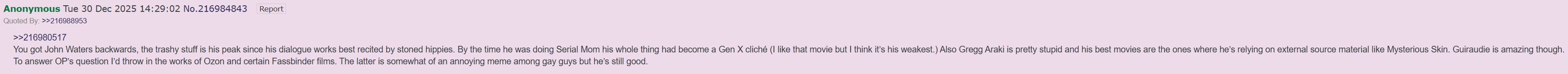 To continue.On Gregg Araki, what do you mean stupid? His films aren't exactly thoughtful yeah, but that's not the appeal, and I don't really care. Araki's appeal is in managing to merge the campy elements with a typical 90s melancholy. It's particularly impressive cause Araki was pushing 40 in the 90s but it feels like those movies were made by a 25-30 year old Gen X'r cause they're quintessentially "90s". In fact Myserious Skin, while his most accessible and easy to recommend, I'd say is one of his weaker movies, he is great with melancholy but him getting sentimental? Not that good. Plus the only time I liked the "oi was roiped and now im gay" story is The Conformist and only cause it was a part of a broader theme rather than the focus. Also important to note that the /pol/ fantasy of "little kid gets molested and turns gay" is more or less a fantasy, most of the homos crying about how they were roiped got fucked in the ass in teenage years cause they were being stupid little queers who willingly fell into the uncle pedo's lap. They all start fucking actively at like 14. Yeah, it's still the pedo who is in the wrong mainly, but a teenager should probably also have some fucking agency about what he is doing here, and if didn't have the agency at least stop trying to pretend that shit was a "oi was ambushed / trapped in a house and forcibly penetrated", this ain't how it happened honey and we all know that. What films by Ozon do you mean? His only really good gay focused movie is White Drops on Burning Rocks (filmed from a Fassbinder script no less). Peter Von Kant is fine but a bit of a pointless remake, also felt a lot more like Almodovar than a Fassbinder stylization I think he was going for. Summer of 85' is boring schmaltz, so is By The Grace of God. Other movies of his feature gay stuff only super briefly or not at all, unless I am forgetting something. His best films overall are 8 Women, Sitcom and already mentioned White Drops on Burning Rocks.