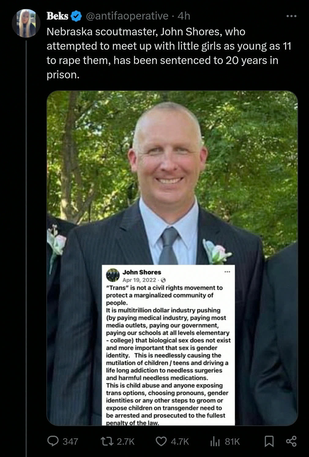 >>217012487the difference is an ideological one. If that guy you posted came out of jail and became a tranny, you'd insist that he have access to children to perform drag queen story hour. Your support of child exploitation is systemic. Exposing children to populations that are high risk for committing child abuse is implicit in your belief system. No-one on the anti-tranny side is saying 'we should ban trannies but also expose children to child predators'. There's no expressed belief on the anti-tranny side which necessitates placing children in high risk situations - unlike with the pro-tranny/pro-gay side. You understand the distinction, right? That guy's a hypocrite, sure. At the individual level, he's a monster, but there's nothing within the anti-lgbt belief system that facilitated his behavior. Of course, you're probably being bad faith.