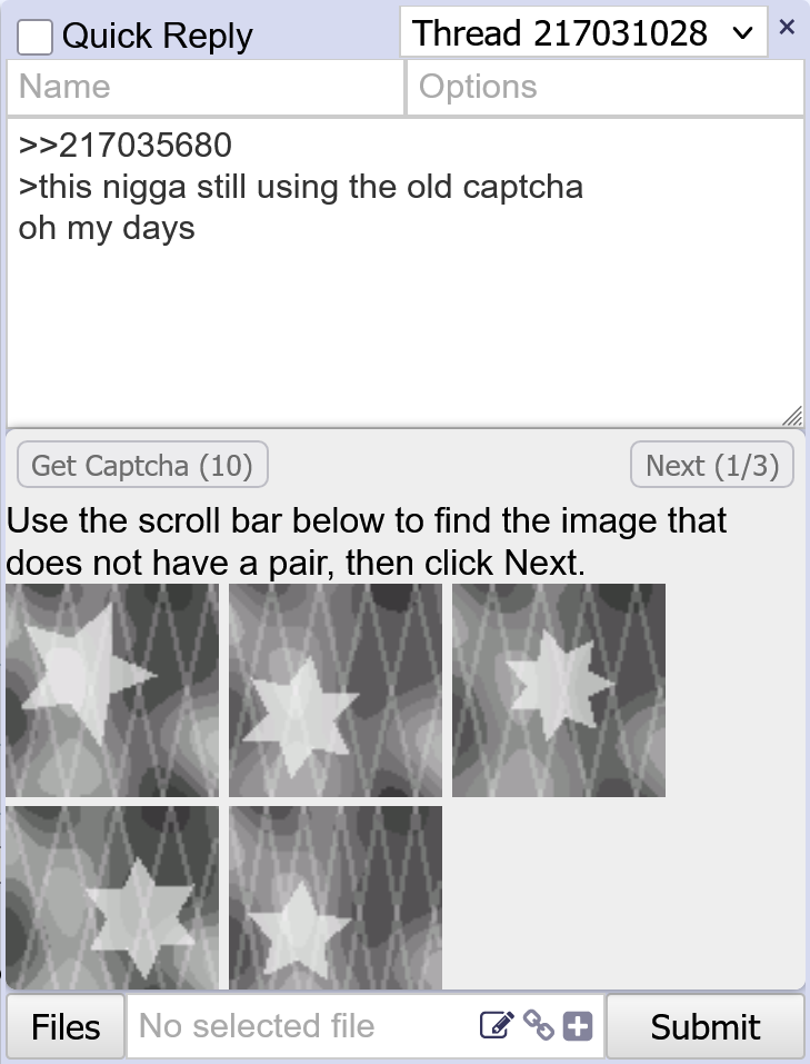 >>217035680>this nigga still using the old captchaoh my days