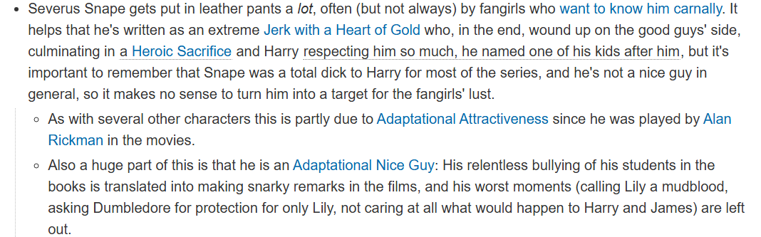 >>217034376Alan Rickman is why. Nobody in the HP book fanbase liked Snape, he's vile and insanely petty. Rickman made him more respectable and played him seductively and that made him attractiveJust so you know, book Snape spends the entirety of the saga seething every second Harry does anything and screaming that it's all a conspiracy, and when he dies he only looks at Harry to see his mother's eyes, not like the movie where it's implied he finally sees Harry has as much of his mother as his father and his death was to save him. Snape in the books is far more selfish and arrogant than film Snape