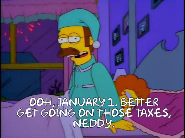 >January 1st! Better get going on those taxes, Neddy!>Daddy, what do taxes pay for?>Policeman, trees, sunshine, let's not forget the folks who just don't feel like working god bless them.