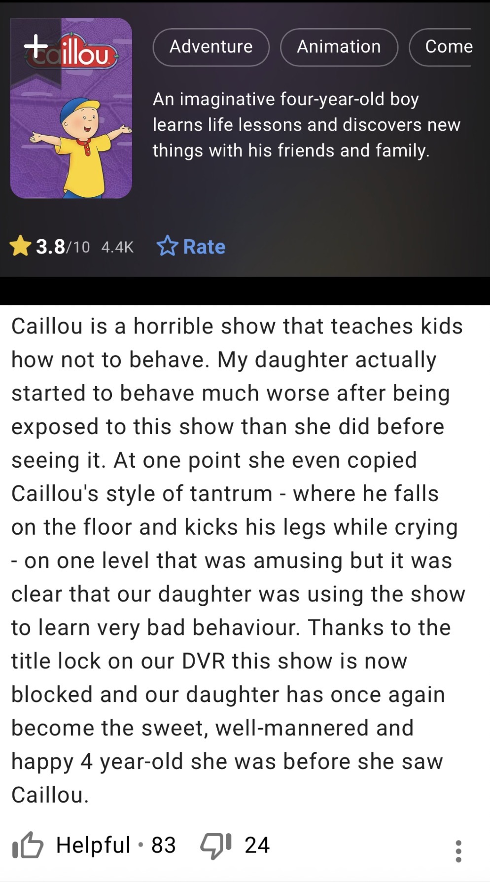 >>217070523>I've asked people about this and the mantra seems to be that Peppa is a brat and when their kids watch it they tend to act up more.Think its the same the Caillou cartoon