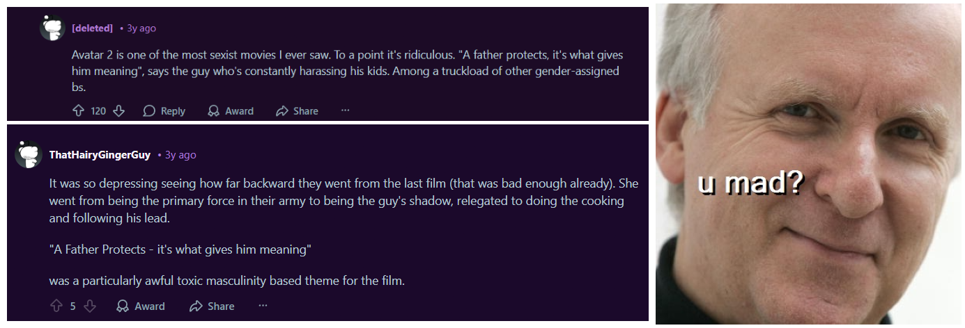 Personally, I found the dynamic between Quaritch and Varang to be a more interesting than Jake and Neytiri, because rather than just wanting eachother, they wanted specific things from eachother [Manpower for Quaritch, and weapons for Varang]. And since Quaritch was already on thin ice with the military, I can only imagine how their relationship will go if he loses access to guns... Also, whale politics, and debating whether to preserve their traditions or adapt to change. I had found the previous films to be somewhat black and white, so it's nice that this one was asking questions.Anyway, here's a meme.