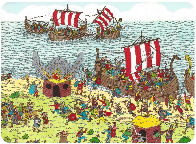 >>217109357Waldo is right in the middle of the lower border of the pic behind the viking with a red shield and the house where a guy is knocked out by a viking