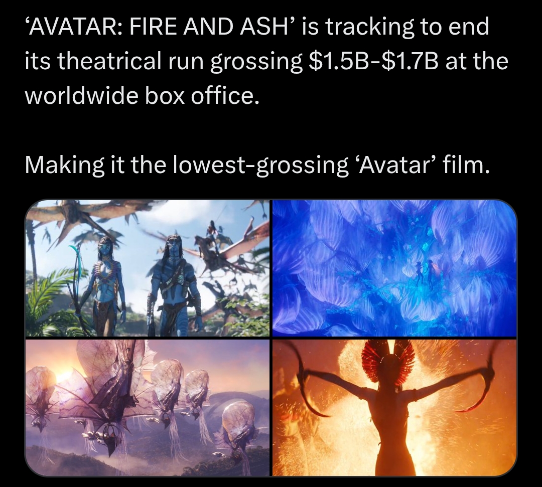 >>217177796I guess this needs to be spoken out.Movie itself has pretty good legs. not much worse than first one and second one.It just opened 25% lower than TWoW overall, and especially in supposedly countries-fans of the franchise like China.Lower box office doesnt speak much about quality of the movie, but more about general tendency of people to skip theaters.Maybe it is because some people got tired of Pandora in general, maybe it is because streaming services hurt theatrical releases, maybe it is because Disney has fucked up not spacing Zootopia 2 and Avatar enough, maybe it is all of that simultaneously.Zootopia 2, for example, absolutely took away 50-100 millions from FaA, especially in China. Also, i think, TWoW overperformed as well. It was post-Covid time and people absolutely needed that escapist movie no matter how restricted access to the theaters was.All in all, FaA performs pretty well given all circumstances. Every studio would kill for 1.7-1.8b final result.