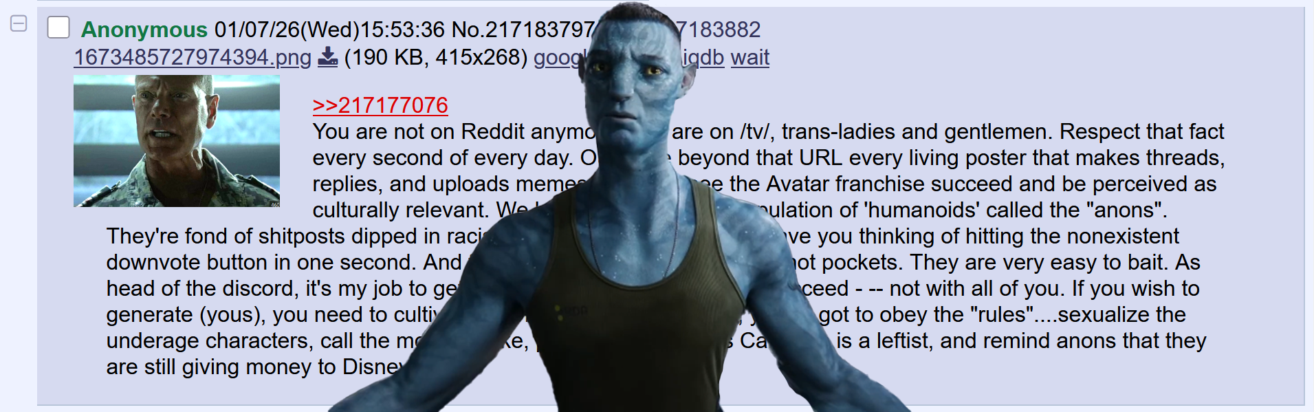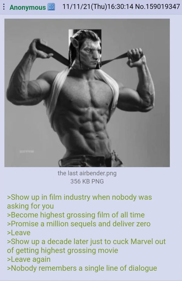 >>217187176>>217187001>Haha, nah, they're a waste of time, I'm above them Yet the anon cares enough to participate in an Avatar general thread and to try and explain things in movies he hasn't seen. It's baffling