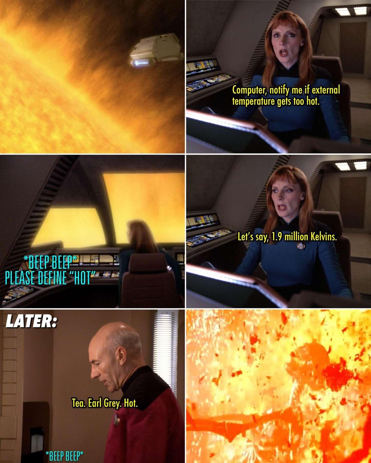 >>217198601Why do some of the crew request specific temperatures on the replicator but Picard only asks for hot? Is hot a default setting or do you personalise your replicator with named presets?