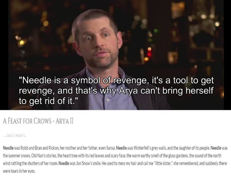 >>217201493This sort of thing makes me want to scream and throw objects at the wall. Not only is it spelled out in the book multiple times, but you would think they AT LEAST would have read a few excerpts from when she hides Needle after joining the temple, or goes back to retrieve it, or her reasons for quitting the temple, or why it is so important to her from the very first moment she gets it etc. It’s part of her identity, a connection to the one brother who saw and loved her for who she is, the brother she might never see again, and it is a tool that has kept her safe many times over. Modern writers have a soullessness about them when it comes to writing female characters. They did something similar with Holly from Stranger Things(a trash show btw I only watched the final season of for the sake of a friend) who wears a necklace her brother gifted her to help her feel safe and confident after being bullied at school. When she loses the necklace(and her connection to the outside world) she is forced to consider the reason that keeps her going, the one thing in the world that keeps her connected to the tangible, and her conclusion is above all, it’s herself. I suppose it’s intended to feel empowering I.e. this young woman is finding herself but it’s so incredibly soulless and not at all subtle, not to mention totally unrealistic, unless you’re a sociopath you don’t think like this